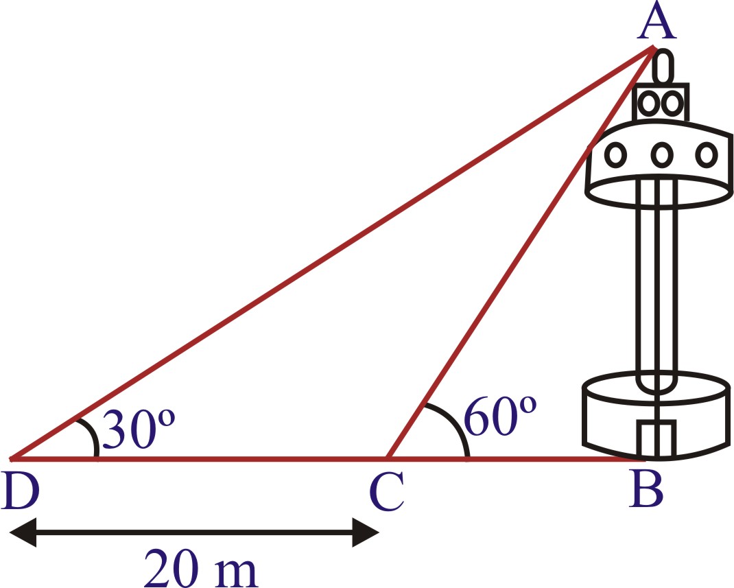 Sol. Let AB be the T.V. tower of height h standing on the bank of a river. Let C be the point on the opposite bank of the river such that BC = x metres. Let D be another point away from C such that CD = 20, and the angles of levation of the top of the T.V. tower at C and D are 60º and 30º respectively. i.e., ∠ACB=60oand∠AOB=30o