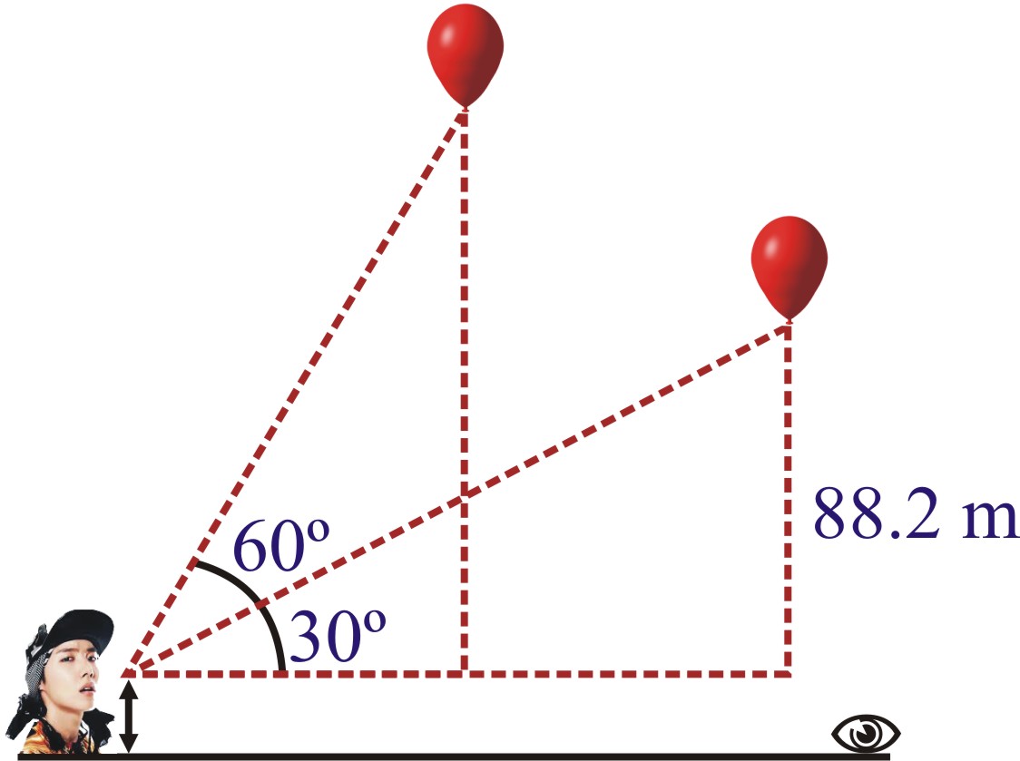 Q.14 A 1.2 m tall girl spots a balloon moving with the wind in a horizontal line at a height of 88.2 m from the ground. The angle of elevation of the balloon from the eyes of the girl at any instant is 60º.