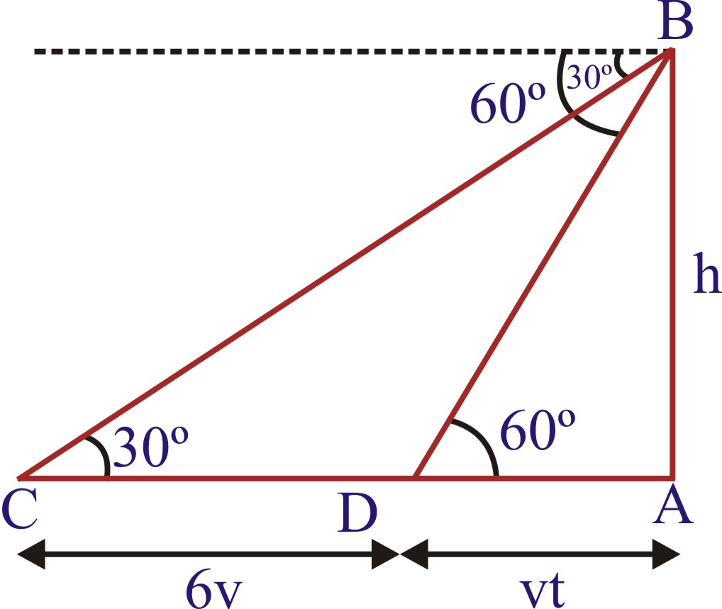 Sol. Let AB be the tower of height h. Let C be the initial position of the car and let after 6 minutes the car be at D. It is given that the angles of depression at C and D are 30º and 60º respectively. Let the speed of the car be υ metre per minute. Then,
