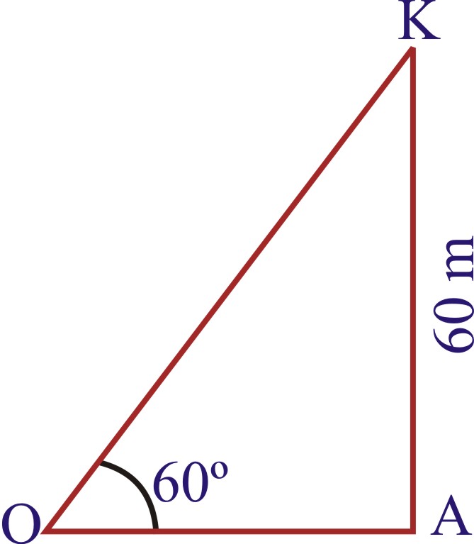 Sol. Let OA be the horizontal ground, and let K be the position of the kite at height 60 m above the ground. Let the length of the string OK be x metres. It is given ∠KOA=60o