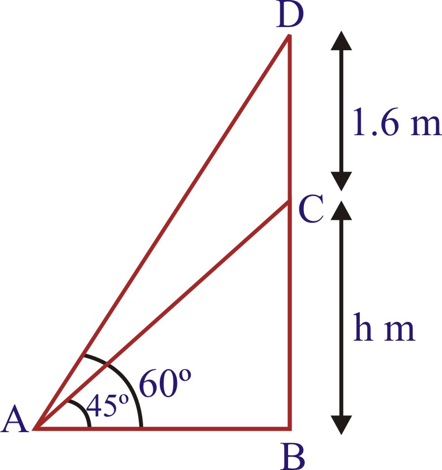 Sol. Let BC be the pedestal of height h metres and CD be the statue of height 1.6 m. Let A be a point on the ground such that ∠CAB=45oand∠DAB=45o From Δs ABC and ABD we have