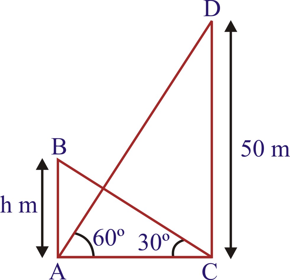 Sol. Let AB be the building of height h and AC, the horizontal ground through C, the foot of the building. Since the building subtends an angle of 60º at C, hence ∠ACB=30o. Let CD be the tower of height 50 m such that ∠CAB=60o From Δs BAC and DCA, we have