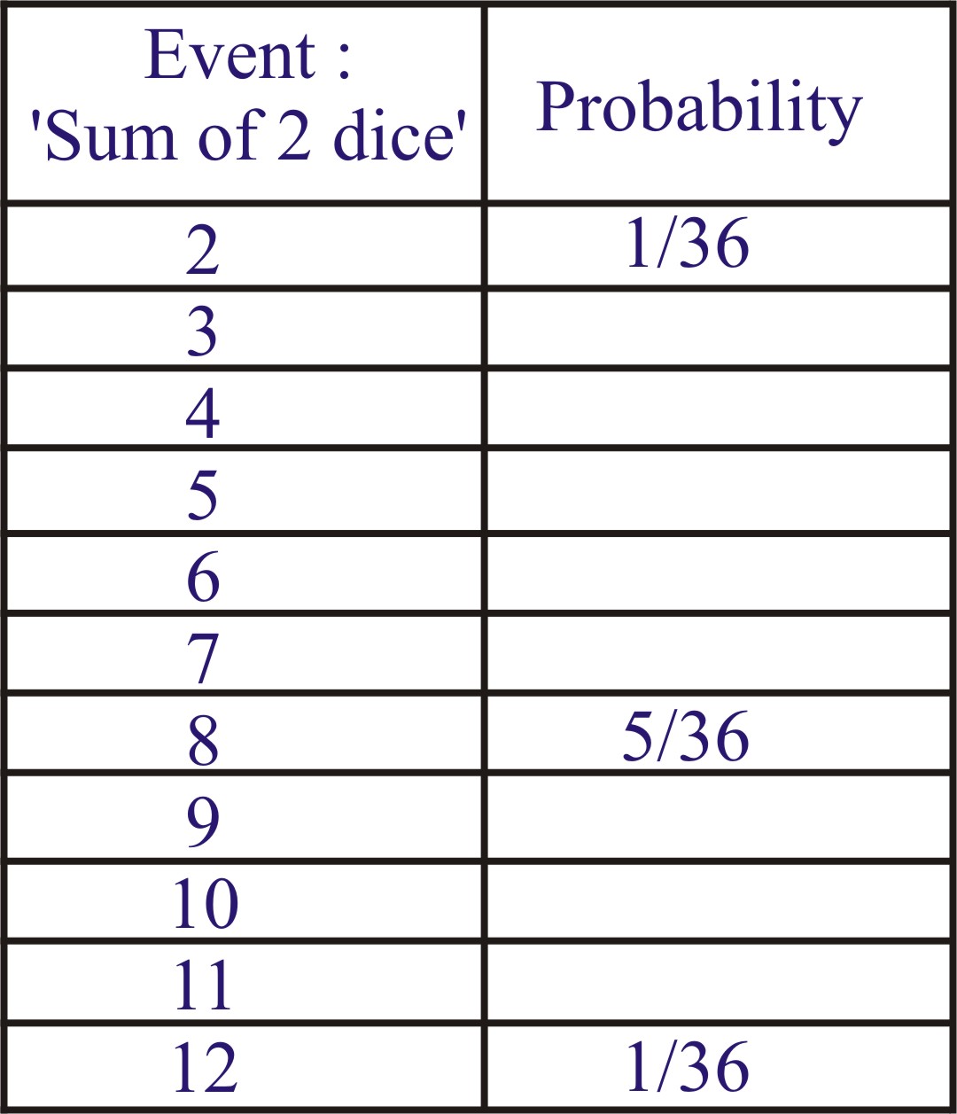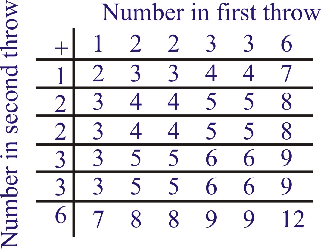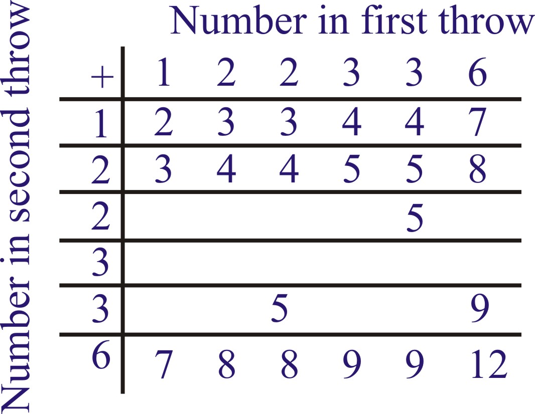 Q.2 A die is numbered in such a way that its faces show the numbers 1, 2, 2, 3, 3, 6. It is thrown two time and the total score in two throws is noted. Complete the following table which gives a few values of the total score on the two throws: