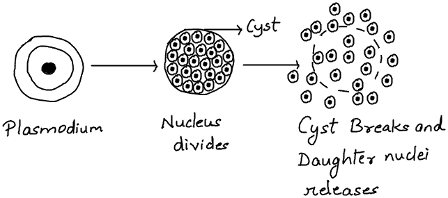 for eg. Plasmodium- Plasmodium reproduces by multiple fission.