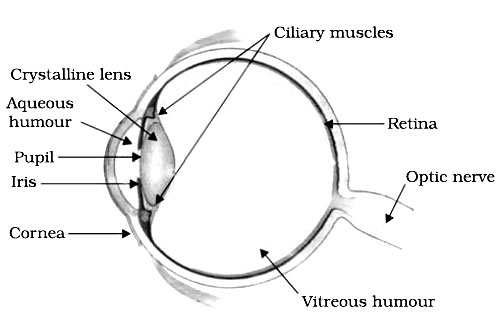 Sol. The eye consists the eyeball having diameter approximately 2.3 cm. The front part of it is transparent, bulging portion called the cornea. Behind the lens is the coloured portion of the eye which controls the amount of light entering the eye the through the pupil. Behind the pupil is a lens made of jelly like substance attached is ciliary muscles, which can control the focal length of the eye lens by changing its shape. At the back of the eye is a light sensitive membrane on which images are formed. The front of lens is filled with a fluid called aqueous humous and behind it by a fluid called vitreous humous.