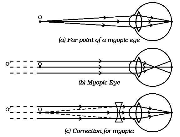 In this defect a person is not able to see faraway objects. This may be caused by the elongation of eyeball on excessive curvature of the converging system of eye. The image is formed in front of the retina. The can be rectified by the diverging the rays by using concave lens.