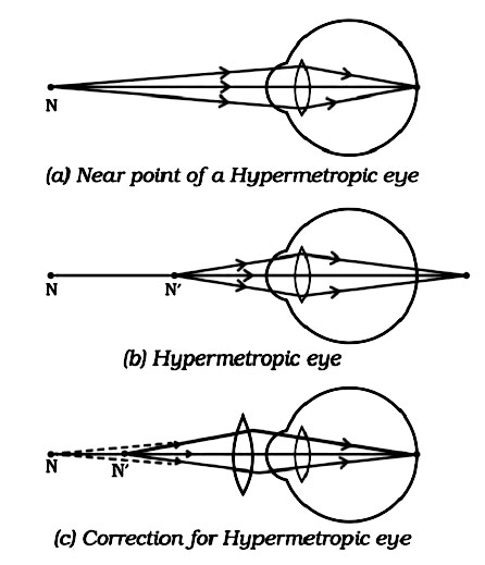 Q.7 Make a diagram to show how hypermetropia is corrected. The near point of a hypermetropic eye is 1 m. What is the power of the lens required to correct this defect ? Assume that the near point of the normal eye is 25 cm.