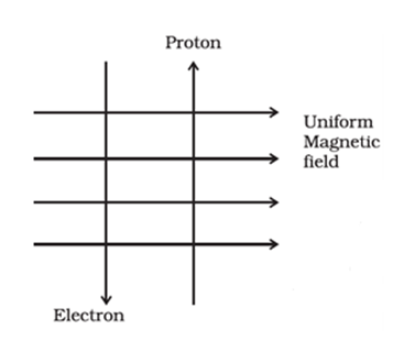 Q.6 A uniform magnetic field exists in the plane of paper pointing from left to right as shown in Figure 13.3. In the field an electron and a proton move as shown. The electron and the proton experience