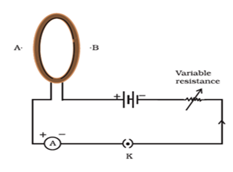 Q.3 A circular loop placed in a plane perpendicular to the plane of paper carries a current when the key is ON. The current as seen from points A and B (in the plane of paper and on the axis of the coil) is anti clockwise and clockwise respectively. Themagnetic field lines point from B to A. The N-pole of the resultant magnet is on the face close to