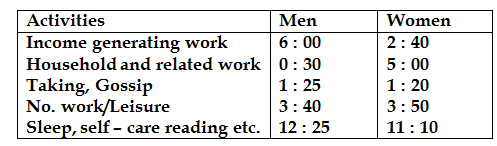 Q.2 A ‘time use survey’ was conducted in six states of our country. It shows that an average woman works every day for a little over seven and half hours while an average man works for six and a half hour. Yet the work done by men is more visible because most of their work leads to generation of income. Generating work, but the bulk of their work is household related. This work remain unpaid and invisible.