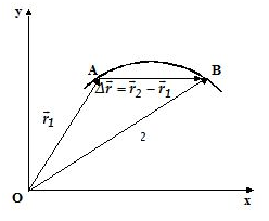Δr→=r2→−r1→ The distance travelled by the particle is the length AB along the curve.