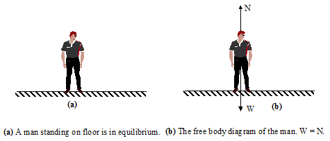 The simplest kind of equilibrium situation is one where two forces act on a body. When you stand motionless, you experience the downward gravitational pull of the earth, your weight W⃗ . The weight is balanced by an upward force exerted on you by the floor. This force is perpendicular to the floor and it is called the Normal Force N⃗ . Note that although N⃗ and W⃗ are equal and opposite, they do not constitute an action-reaction pair.