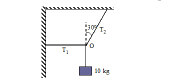 A block of mass 10 kg is suspended with two strings, as shown in the figure. Find the tensions T1 and T2 in the two strings.