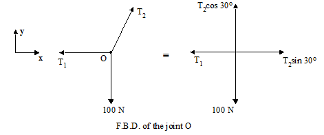 The free body diagram of the joint O is drawn as shown in the following figure.