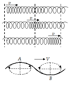 The figure shows a long and elastic spring. When we repeatedly push and pull on end of the spring, the compression and rarefaction of the spring travel along the spring. A particle on the spring moves back and forth, parallel and anti-parallel to the direction of the wave velocity.
