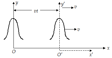 Consider a disturbance or a pulse travelling along x-direction with a velocity v. Let us look at this pulse from two different frames of reference. The xy-frame is stationary, whereas the other frame x‘y’ is moving with velocity v along x-axis, as shown in the figure. We assume that the origins of the two frames concede at t = 0.