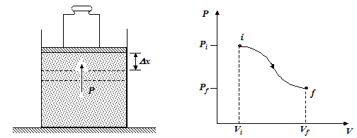 Figure shows a gas confined to a cylinder by a weight on a movable piston. Our system is the gas, whereas the cylinder and the piston form the environment. If the piston is allowed to move upward, the gas expands and does work on it. To calculate the work done by the gas, we assume that the process is quasistatic. In a quasistatic process the thermodynamics variables (P, V, T, n, etc.) of the system and its surroundings change infinitely slowly. Thus, the system is always arbitrarily close to an equilibrium state, in which it has a well-defined volume, and the whole system is characterized by single value of the macroscopic variables. To ensure that the piston moves very slowly, there must be some force, for example, provided by a weight, directed opposite to that due to the pressure. If the piston were to move suddenly, the rapid expansion would involve turbulence and the pressure would not be uniquely defined.