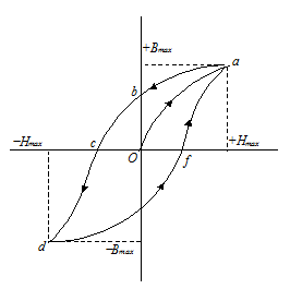 Now reverse the magnetizing force H. The value of B becomes zero at point c at which the substance is no longer a magnet. Now H is increased to -Hmax and graph cd is obtained. Change –Hmax to zero and then to Hmax again curve dfa is obtained. This lagging of the flux density B with respect to the magnetizing force H is called hysteresis and the close loop graph is known as hysteresis loop. The value of H required to destroy the residual magnetism is called the coercivity which is represented by Oc.