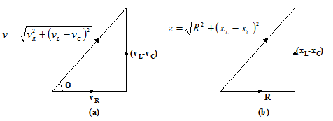 The voltage drop across resistance R be VR in phase with current, voltage drop across inductance L be VL leading the current by 90o and voltage drop across capacitance C be vc lagging the current by 90o. The resultant of vL and vC, (vL – vC) leads the current by 90o, provided (vL > vC) and will lag current by 90o if vC > vL. The resultant voltage is given by