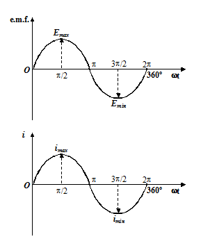 Both the emf and current undergo a complete cycle of changes, having positive and negative value, every time wt changes by 360o or 2π radians as shown in figure.