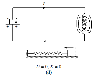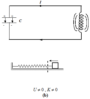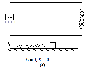 At t = 0, the switch is closed and the capacitor begins to discharge (see b). As the current increases, it sets up a magnetic field in the inductor, and so part of the energy is stored in the magnetic field, UB = 12LI2. When the current reaches its maximum value Io, as in Fig. (c), all the energy is in the magnetic field : UB = 12LI20. The capacitor now has no energy, which means Q = 0. Thus, I =0 when Q = Q0 and Q = 0 when I = I0. The current now starts to charge the capacitor, as in figure (d). In figure (e), the capacitor is fully charged, but with polarity opposite to its initial state in figure (a). The process just described will now repeat itself till the system reverts to its original state. Therefore the energy in the system oscillates between the capacitor and the inductor. As the block-spring system shown in the diagram suggests, the current and the charge in fact undergo simple harmonic oscillations. We will pursue the analogy later.