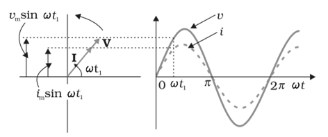 The vertical components of phasors V and I represent the sinusoidally varying quantities v and i. The magnitudes of phasors I and V represent the amplitudes or the peak values vm and im of these oscillating quantities. The projection of voltage and current phasors on vertical axis, i.e., vm sinωt and im sinωt respectively represent the value of current and voltage at that instant.