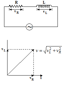In a circuit containing a pure inductance L and a pure resistance R connected in series as shown in figure, when an A. C. voltage is applied in this circuit, the voltage drops on the resistance say vR(= iR in phase with current) and on the L say vL (= ωL), leading the current by 90o. These voltages are shown by the vector diagram in figure.