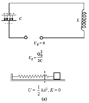 At t = 0, the switch is closed and the capacitor begins to discharge (see b). As the current increases, it sets up a magnetic field in the inductor, and so part of the energy is stored in the magnetic field, UB = 12LI2. When the current reaches its maximum value Io, as in Fig. (c), all the energy is in the magnetic field : UB = 12LI20. The capacitor now has no energy, which means Q = 0. Thus, I =0 when Q = Q0 and Q = 0 when I = I0. The current now starts to charge the capacitor, as in figure (d). In figure (e), the capacitor is fully charged, but with polarity opposite to its initial state in figure (a). The process just described will now repeat itself till the system reverts to its original state. Therefore the energy in the system oscillates between the capacitor and the inductor. As the block-spring system shown in the diagram suggests, the current and the charge in fact undergo simple harmonic oscillations. We will pursue the analogy later.