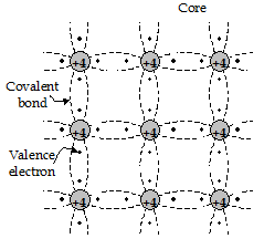 Each atom of an intrinsic semiconductor (Ge or Si) has four valence electrons. These four electrons of each atom form covalent bonds with the four neighbouring atoms. Thus, the semiconductor has tetrahedral lattice structure. A simplified two-dimensional representation of this crystalline structure is shown in figure. The core represents the nucleus and all the orbiting electrons except the four valence electrons. Therefore the core has +4 charge. A covalent bond consists of two electrons, one from each adjacent atom. At 0 K, all the valence electrons are tightly bound to the parent atoms. No free electrons are available for electrical conduction. Hence, the semiconductor behaves as a perfect insulator at 0 K.