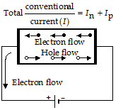 When a battery is connected across a semiconductor, the free electrons drift towards +ve terminal and holes drift towards –ve terminal. The total current I is summation of the current due to electron flow In and the current due to hole flow. The current in the connecting wire is due to electron flow.