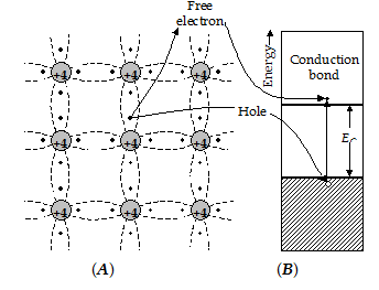 When an electron breaks a covalent bond and moves away, a vacancy is created in the bond. A positive charge is associated with this vacancy. This vacancy is called a hole. Free electrons and holes are always generated in pairs. At any time, the concentration of free electrons is same as the concentration of holes in an intrinsic semiconductor,