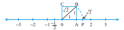 (iii) Now, draw a number line. Mark point A which will be 2 units from origin. Then draw perpendicular line segment AB of unit length. Take origin as centre and OB as radius; draw an arc intersecting number line at C.