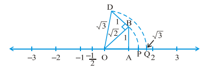 (ii) For already drawn √2, draw unit perpendicular length BD to OB. Now, keeping O as centre draw an arc from point D which will intersect the number line at Q.