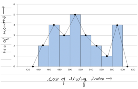 For Example: Draw, in the same diagram, a histogram and a frequency polygon to represent the following data which shows the monthly cost of living index of a city in a period of 2 years: