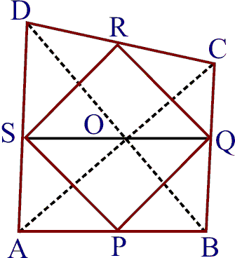 Given : In a quadrilateral ABCD, P, Q, R and S are respectively the mid- points of AB, BC, CD and DA. PR and QS intersect each other at O.