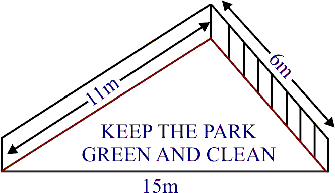 Q.3 There is a slide in a park. One of its side walls has been painted in blue colour with a message “KEEP THE PARK GREEN AND CLEAN” (See figure). If the sides of the wall are 15 m, 11 m and 6 m, find the area painted in colour.