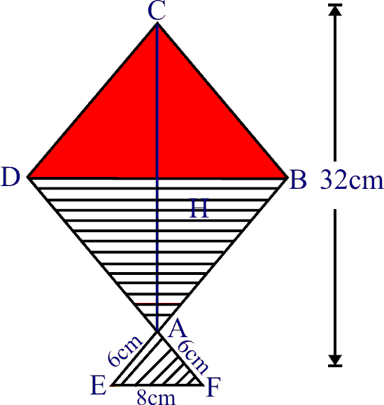 Q.7 A kite in the shape of a square with a diagonal 32 cm and an isosceles triangle of base 8 cm and sides 6 cm each is to be made of three different shades as shown in figure. How much paper of each shade has been used in it ?