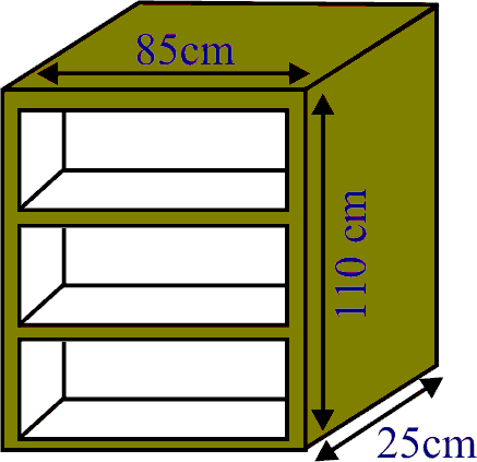 Q.1 A wooden bookshelf has external dimensions as follows : Height = 110 cm , Depth = 25 cm, Breadth = 85 cm (see figure). The thickness of the plank is 5 cm everywhere. The external faces are to be polished and the inner faces are to be painted . If the rate of polishing is 20 paise per cm2 and the rate of painting is 10 paise per cm2, find the total expenses required for polishing and painting the surface of the bookshelf.