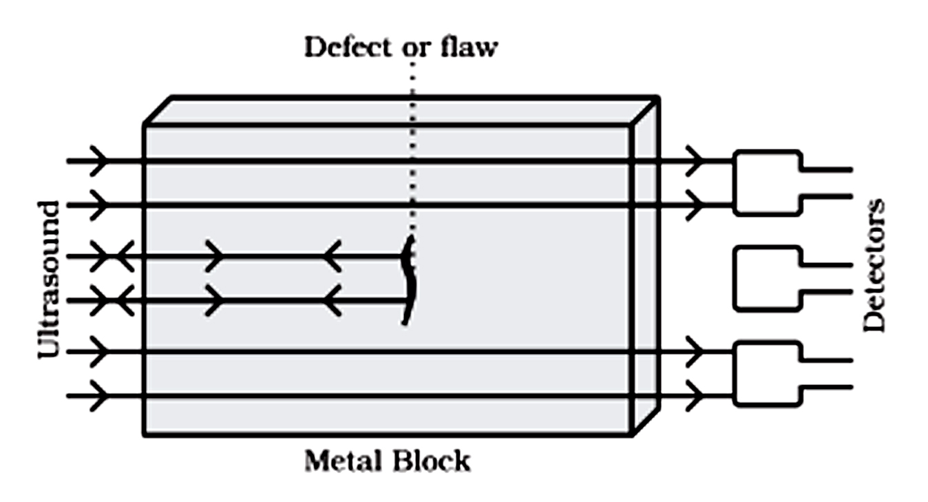Sol. Ultrasound is passed through the metal block which has to be tested. In case of flaws ultrasound does not pass through it but is reflected back. A detector on the other side of the block does not receive all the transmitted waves and hence the flow is detected .
